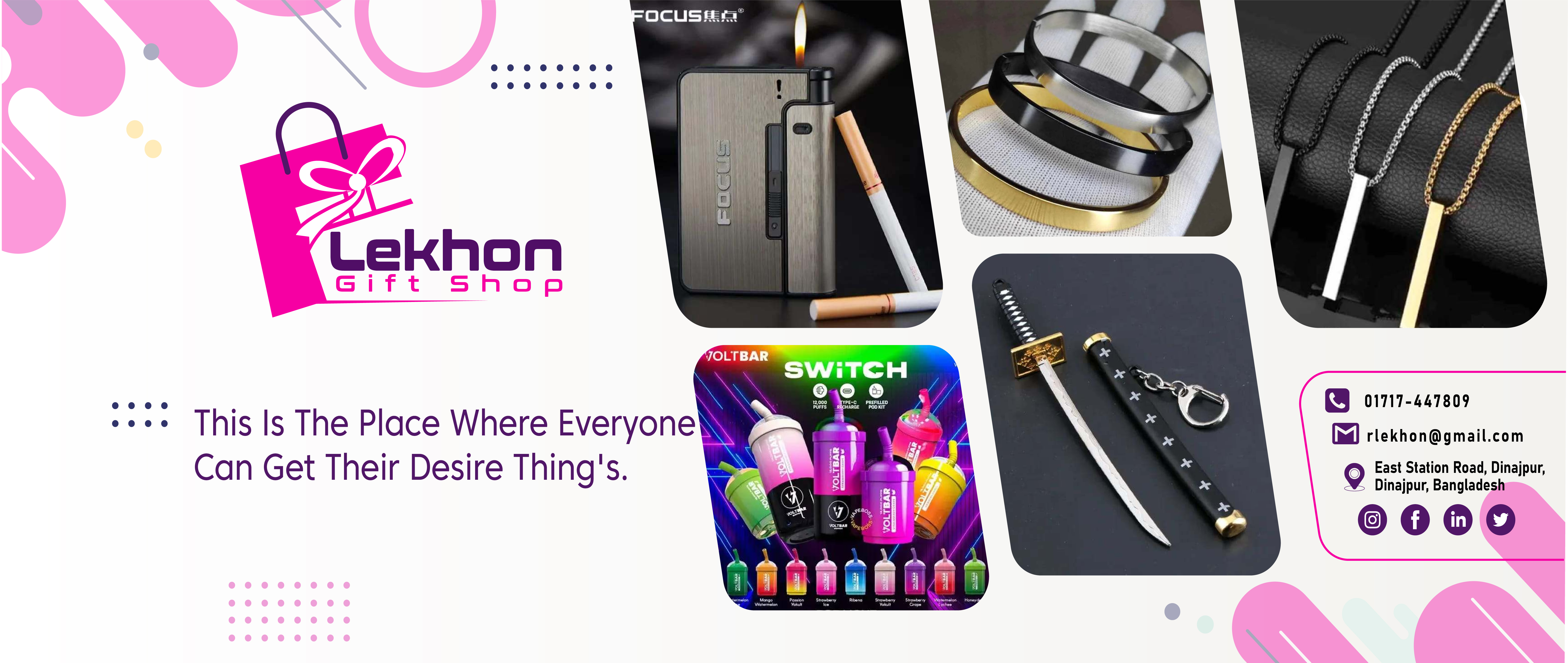 ই সিগারেট, ভ্যাপ,পাপস , লাইটার, জিপ্পু লাইটার,বং ,লিকুইড, নিক সল্ট ,চেন ,ব্যাস, লাইট, রিং বিভিন্ন গিফট আইটেম পাওয়া যায়
